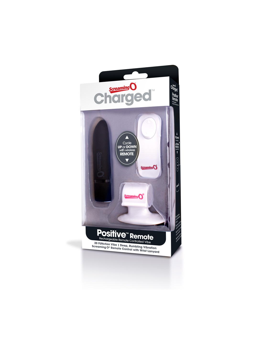 Positive Remote control es un vibrador a modo de bala, con una superfcie lisa, sin poros muy funcional y versátil. Es recargable con cable USB (Incluido), sumergible y tiene un tamaño manejable y cabeza totalmente redondeada, ideal para la estimulación del clítoris o cualquier zona erógena. Incorpora un potentísimo motor de 20 funciones distintas de vibración. El tamaño y la apariencia tan discreta lo hará el compañero perfecto de viaje. Puede controlarse con el botón en el dispositivo o mediante un control remoto inalámbrico que funciona hasta a 12 metros de distancia. Incluso se puede usar su soporte de carga como soporte para acomodar los dedos para aumentar el juego en solitario o dar a la pareja un masaje sensual. Es muy fácil de limpiar y es totalmente sumergible. Se recomienda utilizar lubricante a base de agua para su uso y rasurar la zona íntima para evitar daños. En color negro.