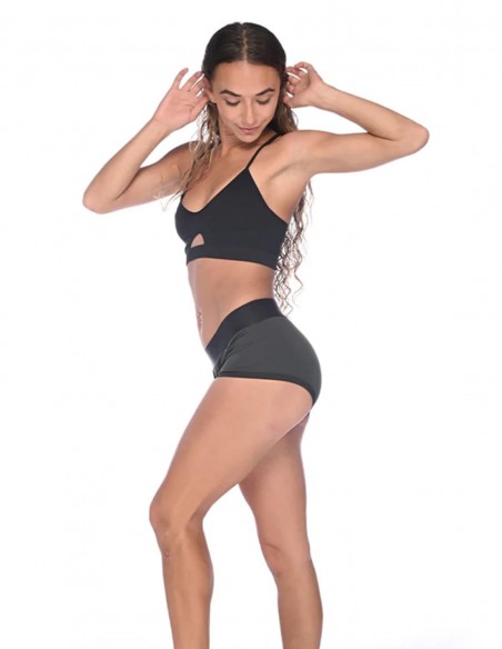 Confeccionado en tela, gris y negra, suave y elástica que proporciona un ajuste firme y seguro de los accesorios. Añade una goma que se ciñe a la cintura para una sujeción superior y una anilla estable entre la tela de 38,1 mm de diámetro. Diseñado con dos bolsillos para colocar 2 balitas vibradoras en la zona del pubis y en la zona íntima.