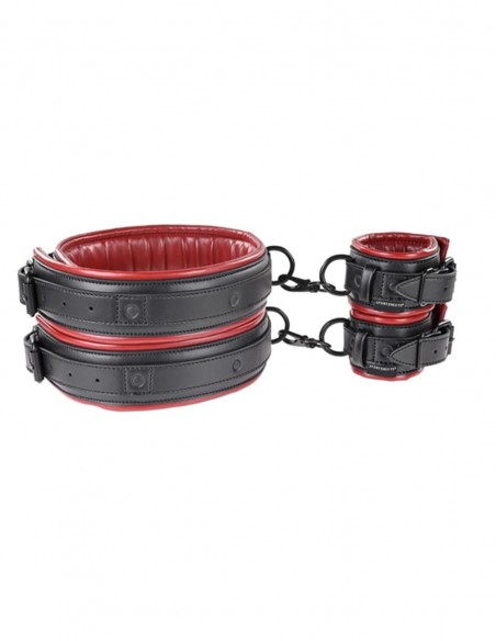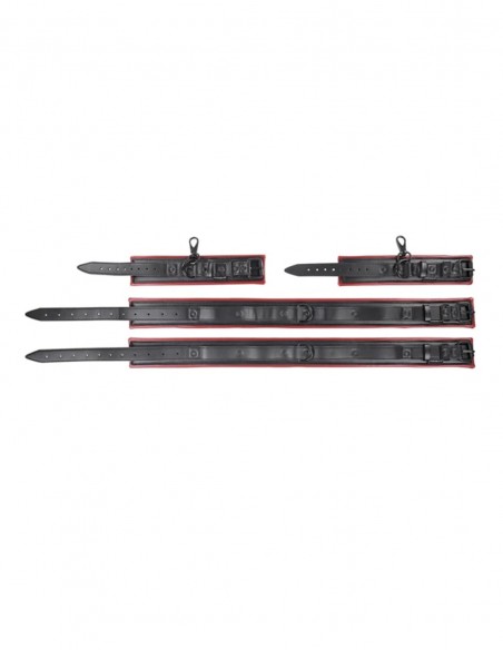 Se trata de dos elementos por separado que cada uno une el muslo con la muñeca. Los elementos son suaves y acolchados, realmente muy cómodos y con un diseño sofisticado. Las esposas son regulables y ajustables a la medida que se desee, con un sistema a modo de cinturón y una hebilla de bloqueo. Gracias a su sistema de hebillas y clips abre un gran abanico de combinaciones y posibilidades de uso. Está pensado para que la persona que va a ser atada quede con movilidad reducida de manos y piernas. Las esposas pueden utilizarse de manera independiente