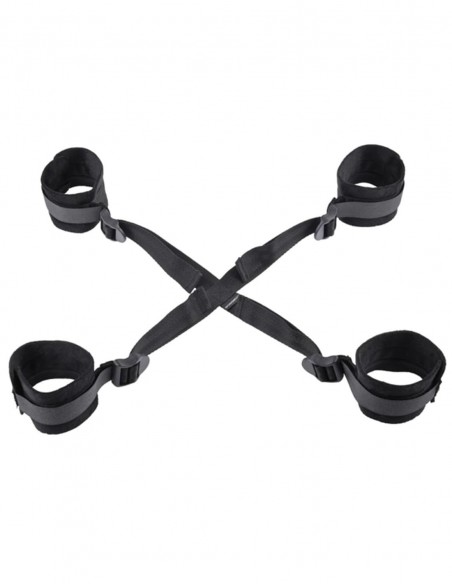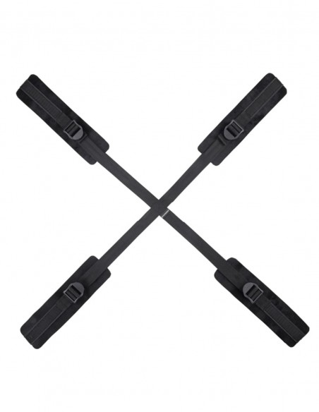 Se trata de una cruz hecha de dos tiras regulables y a cada extremo se encuentran esposas que unen las cuatro extremidades. Gracias a su sistema para ajustar más o menos abre un gran abanico de posibilidades de uso. Está pensado para que la persona que va a ser atada quede inmovilizada de manos y pies a la vez. Las esposas y tobilleras se ajustan mediante velcro y son muy suave al tacto.