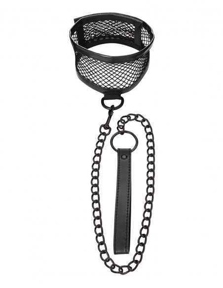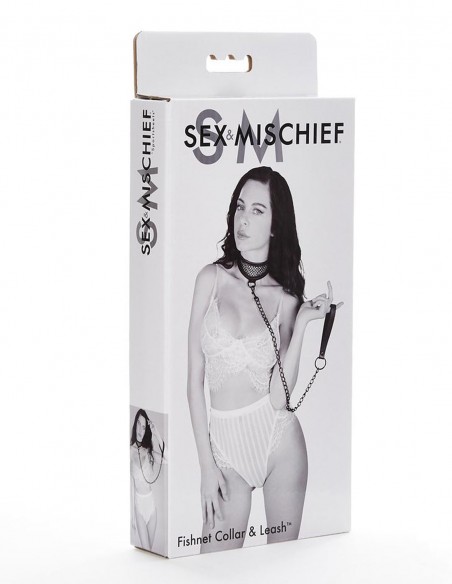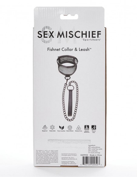 Fishnet Collar and Leash es un collar con diseño de rejila que se ajusta perfectamente al cuello mediante un velcro y que va atado con un gancho a una correa de cadenas negras con el mango de imitación al cuero. El collar se puede utilizar con la correa o por separado y es compatible con otros juguetes de retención de la marca Sportsheets. Sus materiales son: 40% poliuretano, 28% metal sin níquel, 25% poliéster, 7% cierres de gancho.