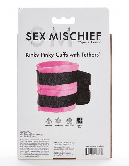 La parte que sujeta la muñeca es de peluche rosa y las tiras son de poliéster negro. Son perfectamente ajustables y se atan con velcro. Con estas esposas se podrá probar gran una gran variedad de posiciones gracias a que se pueden atar donde cada persona lo desee. Sus materiales son: 43% poliéster, 42% correas de polipropileno, 15% velcro.