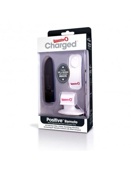 Positive Remote control es un vibrador a modo de bala, con una superfcie lisa, sin poros muy funcional y versátil. Es recargable con cable USB (Incluido), sumergible y tiene un tamaño manejable y cabeza totalmente redondeada, ideal para la estimulación del clítoris o cualquier zona erógena. Incorpora un potentísimo motor de 20 funciones distintas de vibración. El tamaño y la apariencia tan discreta lo hará el compañero perfecto de viaje. Puede controlarse con el botón en el dispositivo o mediante un control remoto inalámbrico que funciona hasta a 12 metros de distancia. Incluso se puede usar su soporte de carga como soporte para acomodar los dedos para aumentar el juego en solitario o dar a la pareja un masaje sensual. Es muy fácil de limpiar y es totalmente sumergible. Se recomienda utilizar lubricante a base de agua para su uso y rasurar la zona íntima para evitar daños. En color negro.