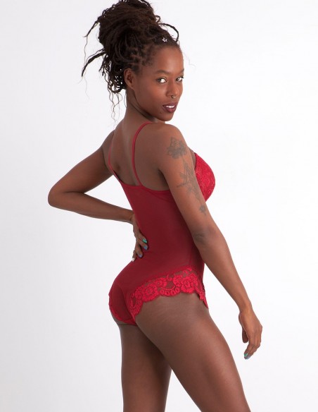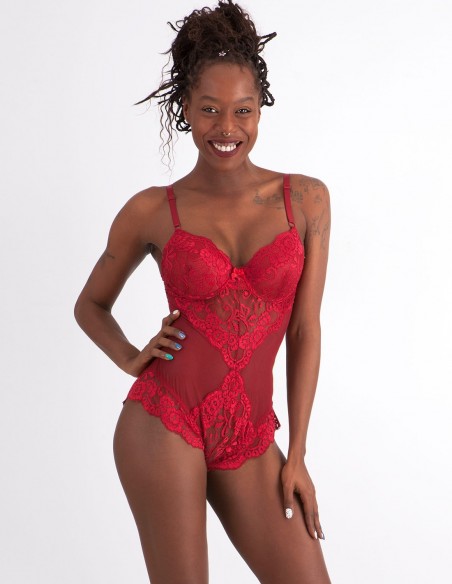 Body muy sensual y elegante en color vino, que combina zonas semitransparentes con encajes florales. Los tirantes son regulables y el pecho tiene aros. Tanto la zona del pubis como la parte inferior del pecho y el propio pecho vienen adornados con motivos florales muy delicados, al igual que los ribetes que acaban en la zona inferior del body. El body acaba en formato braguita y queda ceñido al cuerpo resaltando las curvas, aportando un toque eròtico y muy sexy. Confeccionado en 92% nailon y 8% elastano. Talla única.