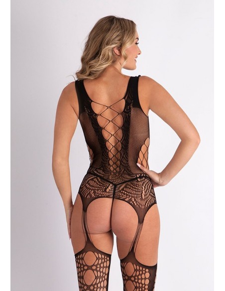 Bonito bodystocking de color negro elaborado en malla de diferentes aberturas combinando con detalles florales. Visualmente dividido en la parte superior con diseño de bustier y en la parte inferior unas medias unidas con un liguero. El bustier tiene dos tirantes gruesos y un escote muy pronunciado en forma de V que llega hasta el vientre. La espalda también tiene aberturas en forma de V hasta la lumbar. Las medias, con el mismo diseño que el resto, le dan un toque picante ya que la parte de la zona íntima es totalmente descubierta y el liguero que une ambas partes está formado por varias tiras finas que le dan un toque delicado al conjunto. Un bodystocking muy original y sensual, que queda ceñido al cuerpo marcando la silueta. Confeccionado en 92% nailon y 8% elastano. Talla única.