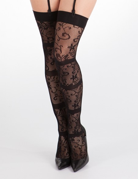 Conjunto de 4 piezas formado por un bustier con liguero, un tanga, medias y guantes. Todo el conjunto sigue la misma línea de diseño, formado por red de media pequeña combinado con estampados florales. El bustier está formado por tirantes finos que envuelven los pechos dejándolos completamente al descubierto y realzándolos. Cubre totalmente el vientre y parte de la espalda hasta la cadera, donde acaba con unos ligueros que se unen a las medias que van a conjunto. Las medias tienen un borde grueso en color negro para mayor fijación en la pierna y siguen el mismo diseño que el resto de la lencería. El tanga y los guantes van totalmente a conjunto que el resto. Los guantes son largos y dejan los dedos al descubierto. Un conjunto realmente muy delicado y atrevido. Confeccionado con 90% poliamida y 10% elastano. Talla única.
