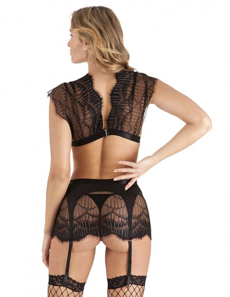 Conjunto de 4 piezas confeccionadas en encaje negro con diseño floral. La parte de arriba es estilo top que se abrocha por detrás con un gancho, tiene una tira inferior elástica y tanto por delante como por detrás su diseño es en forma de V. Incorpora liguero a juego con el top, tanga de rejilla negro y medias de red con bordes de encaje. ¡Un conjunto elegante y muy sensual que te hará sentir irresistible!
