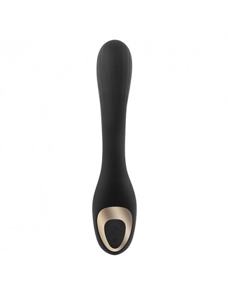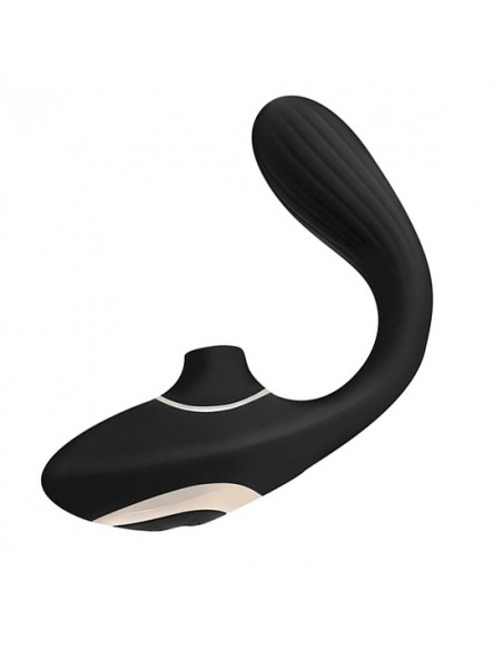 Su diseño es muy ligero y se adapta a la perfección a todo tipo de cuerpos. Formado por dos motores independientes, uno que actua de manera interna estimulando con potentes vibraciones la zona G, y el otro estimulando por succión el clítoris. La parte que se introduce es muy suave, con punta redondeada y con un flexo para adaptar a la perfección la colocación del juguete. Fabricado en silicona de color negro y detalles en ABS. La parte que se introduce vaginalmente tiene 10 modos de vibración y la succión tiene hasta 10 patrones. Tiene una interfaz muy intuitiva con dos botones de fácil control. Es recargable y totalmente sumergible. Su tiempo de carga es de 90 minutos para 1h de uso.