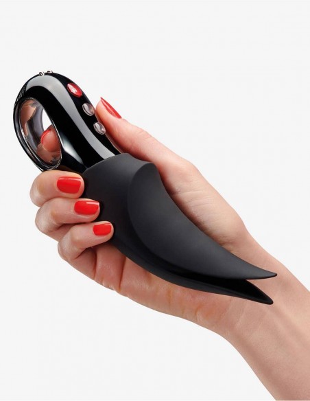 Gracias a su mango ergonómico en forma de loop se adaptará perfectamente a la mano: el dedo índice se introduce por el aro plateado y el juguete queda sujeto cómodamente, mientras el pulgar maneja intuitivamente el teclado. Tiene un potente motor con una vibración potente, dispone de 6 velocidades de vibración y 6 patrones diferentes que no te dejarán indiferente... Si quieres jugar con tu pareja solo tienes que poner un poco de lubricante entre las puntas y deslizarzo hacia arriba y hacia abajo!