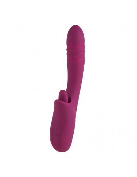 Se trata de un juguete muy especial y multifuncional, ya que añade la función de empuje en su eje principal y una lengua que crea suaves caricias o golpecitos para el clítoris. Es un vibrador rígido y de superficies suave. La punta del eje principal es ligeramente más voluminosa y curvada que el resto, ideal para acariciar la zona G. Añade estrías en la zona del glande dándole un toque realista y el agarre resulta muy ergonómico ya que se adapta cómodamente a la palma de la mano.