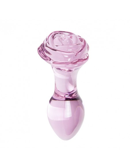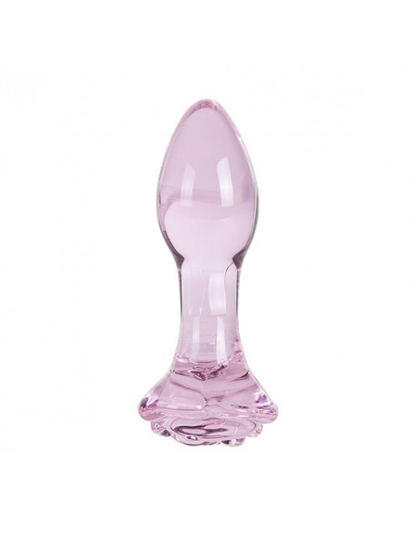 Plug de vidrio rosa transparente diseñado para la estimulación anal. Posee una punta cónica para facilitar la penetración. La base tiene un diseño especial que imita una rosa, haciéndolo más glamuroso y elegante. Gracias a esta rosa el agarre es firme y seguro. Se pueden obtener sensaciones adicionales al poder jugar con la temperatura gracias a las propiedades del vidrio. Se trata de un juguete muy fácil de limpiar y totalmente sumergible. Su diseño y su forma lo convierten en una pieza muy delicada y fina. Tiene una longitud insertable de 9,8 cm. Totalmente apto para ser usado con cualquier lubricante, ya sea a base de silicona o de agua, y mejorar así la fricción.