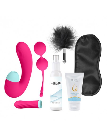 Pleasure Kit es un increíble pack de 2 juguetes, 1 producto de salud íntima, 2 productos de cosmética erótica y 2 elementos del mundo bondage. Todo ello diseñado para los juegos eróticos en solitario o en la mejor compañía. En este pack viene incluido una bala vibradora para zonas erógenas, un estimulador doble para punto G y clítoris, unas bolas Kegel para fortalecer el suelo pélvico, un lubricante a base de agua, un limpiador de juguetes, una plumita y un antifaz. La bala posee potentes vibraciones para masajear zonas erógenas del cuerpo, el doble estimulador tiene vibración/pulsación para la zona G y para el clítoris ondas de presión que crean efecto succión y las bolas Kegel tienen un peso de 67 g para tonificar la musculatura pélvica. Los tres están fabricados 100% en silicona suave y muy agradable al tacto. El motor de ambos juguetes incluye un total de 10 patrones de vibraciones y succión. Son recargables con cable USB (incluido) y tienen un acabado impermeable que los hacen totalmente aptos para utilizarlo debajo del agua. El pack también incluye un lubricante natural a base de agua de 50 ml ideal para combinarlo con los juguetes y un limpiador de juguetes ideal para combinarlo con el pack y mantener higienizados los juguetes. Además, el pack concluye con un antifaz para introducirse en el mundo de los juegos bondage y una plumita de cosquilleo.