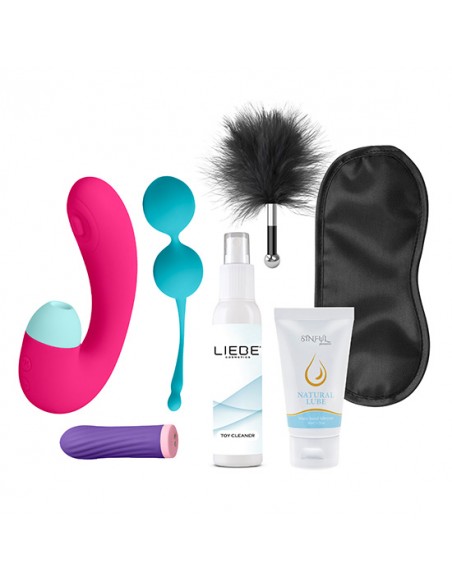 Pleasure Kit es un increíble pack de 2 juguetes, 1 producto de salud íntima, 2 productos de cosmética erótica y 2 elementos del mundo bondage. Todo ello diseñado para los juegos eróticos en solitario o en la mejor compañía. En este pack viene incluido una bala vibradora para zonas erógenas, un estimulador doble para punto G y clítoris, unas bolas Kegel para fortalecer el suelo pélvico, un lubricante a base de agua, un limpiador de juguetes, una plumita y un antifaz. La bala posee potentes vibraciones para masajear zonas erógenas del cuerpo, el doble estimulador tiene vibración/pulsación para la zona G y para el clítoris ondas de presión que crean efecto succión y las bolas Kegel tienen un peso de 67 g para tonificar la musculatura pélvica. Los tres están fabricados 100% en silicona suave y muy agradable al tacto. El motor de ambos juguetes incluye un total de 10 patrones de vibraciones y succión. Son recargables con cable USB (incluido) y tienen un acabado impermeable que los hacen totalmente aptos para utilizarlo debajo del agua. El pack también incluye un lubricante natural a base de agua de 50 ml ideal para combinarlo con los juguetes y un limpiador de juguetes ideal para combinarlo con el pack y mantener higienizados los juguetes. Además, el pack concluye con un antifaz para introducirse en el mundo de los juegos bondage y una plumita de cosquilleo.