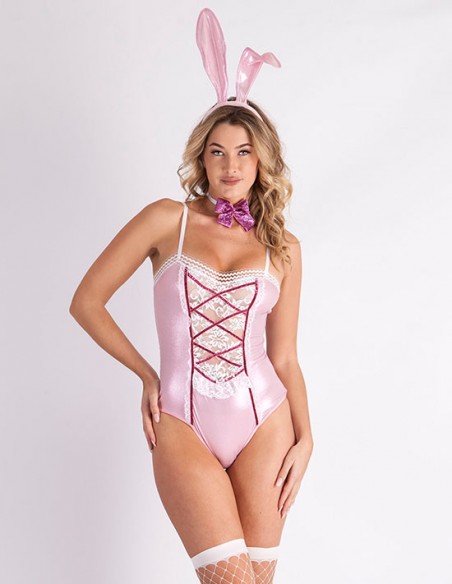 Sensual disfraz de conejita compuesto por 5 piezas, un body, una diadema con orejitas, un collar con un lazo, unas medias blancas y una cola peluda. El body es de color rosa, con detalles en encaje blanco floral en el escote y vientre. Con tiras finas regulables y el body es acabado en braguita clásica. Añade un collar con un gran lazo brillante rosa y se ata por la nuca. Añade también una diadema con orejitas de conejo que completan el conjunto dando un toque muy dulce a la vez que inocente. Termina con una cola peludita de color blanco. Para acabar de completar el conjunto viene con medias blancas de red mediana y liga opaca blanca. Un disfraz divertido y dulce, ideal para salir de lo común y aventurarse en un gran abanico de juego de fantasía en la mejor compañía. Confeccionado en 87% poliéster y 13% elastano. Talla única.