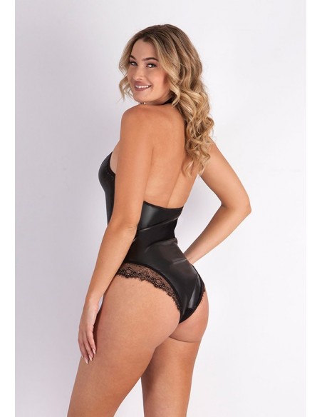 Body muy atrevido y cañero elaborado en su gran mayoría de tela brillante que imita el látex y combinada con detalles en encaje negro floral. Se abrocha por el cuello y deja los hombros al descubierto. El busto y el pecho queda decorado por fino encaje floral y este baja hasta el ombligo formando una sensual y provocativa V. La zona íntima queda semicubierta por tela en encaje. Media espalda queda al descubierto y el body es acabado en forma de braga. Un conjunto muy cañero a la vez que delicado y sensual. Confeccionado de 90% poliéster y 10% elastano. Talla única.