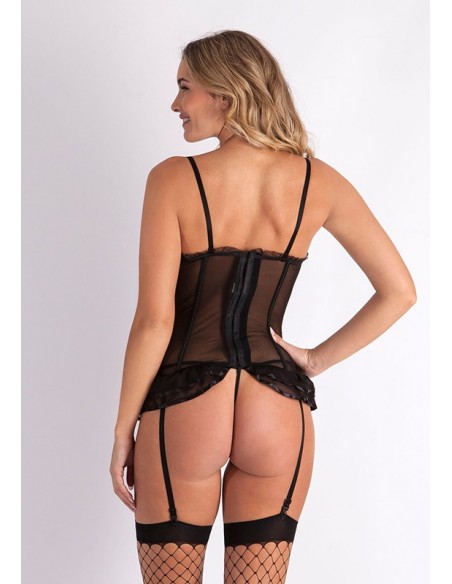 Conjunto de 3 piezas compuesto por un bustier con liguero, tanga simple y medias. El conjunto está confeccionado en tela negra, con bordes ondulados y volantes.