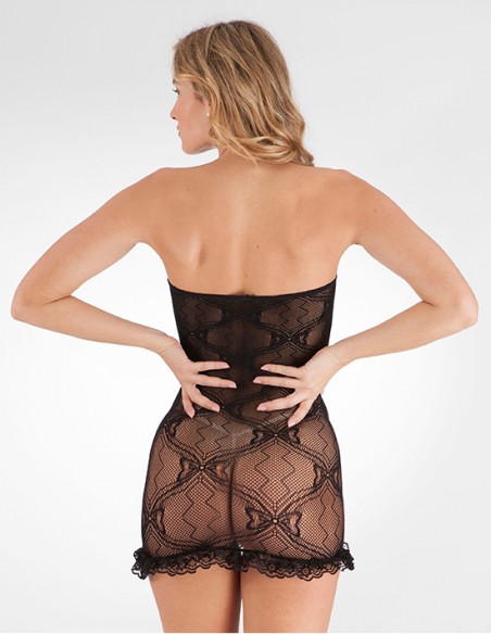 Sencillo vestido en formato palabra de honor de color negro. Elaborado con malla de rejilla pequeña y con estampados en forma de lacito por todo el vestido. El escote queda totalmente descubierto alzando el pecho gracias a la gran abertura que tiene. Se trata de un vestido muy corto que llega justo por debajo de las nalgas, completándolo con volantes en encaje y una goma que se ajusta a la silueta. El conjunto no incluye el tanga. Confeccionado con 90% poliamida y 10% elastano. Talla única.