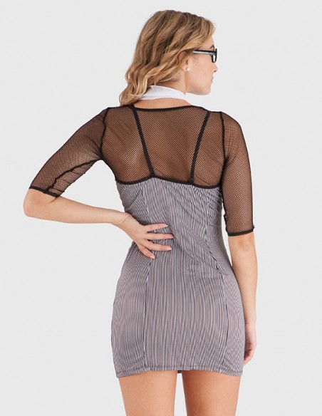 Disfraz de profesora en color negro y blanco. Compuesto por vestido transparente, las mangas y los hombros son semi transparentes en color negro y el vestido llava botones y bolsillos. Un disfraz muy provocativo para castigar a tu alumno! Viene en caja para colgar.