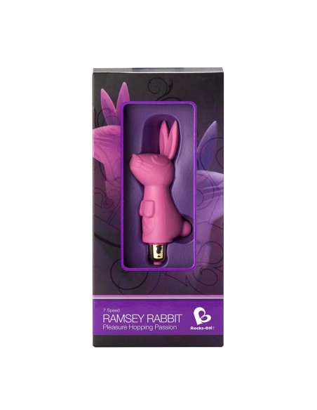 Ramsey Rabbit 7 es un vibrador para zona externa en una divertida forma de conejito. Puedes estimular directamente o, a modo de pinza, gracias a las orejitas del conejo. Tiene 7 vibraciones potentes y de larga duración que son proporcionadas por la sorprendente bala vibradora de RO-80 (incluida). Es sumergible y fácil de limpiar. Funciona a pilas.