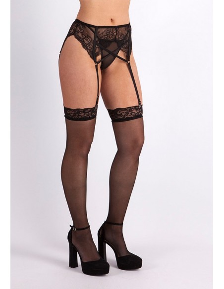 Delicado y elegante conjunto de liguero, tanga y medias en color negro.