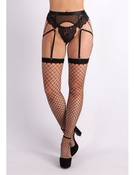 Elaborado en fina tela de encaje con motivos florales, con acabados ondulados y combinando partes de tela semitransparente en vientre y lumbar. El liguero queda reforzado con una goma que se ajusta en la cintura y por donde bajan un juego de ligueros regulables, formando un bonito diseño en caderas y muslos. El tanga es fino, delicado y elaborado de encaje en la zona del pubis, siguiendo la estética del conjunto. Incluye también medias de red mediana con liga opaca negra. Un conjunto ideal para combinarlo con otras prendas de lencería y añadirle un toque especialmente sensual. Confeccionado en 92% nailon y 8% elastano. Talla única.