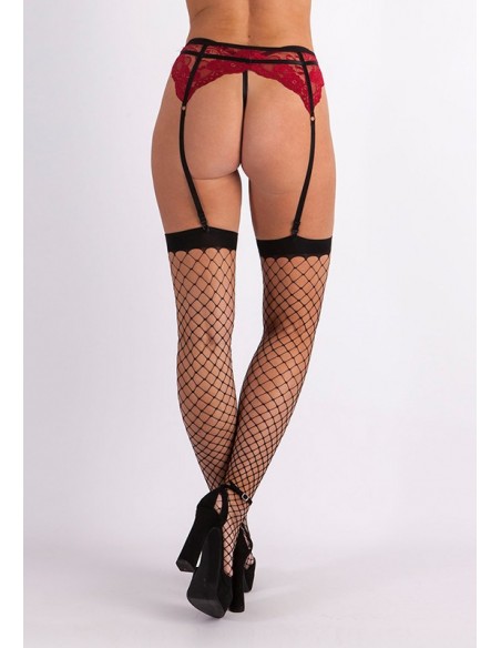 Elaborado en fina tela de encaje roja con motivos florales, con acabados ondulados y combinando finas gomas negras que se ajustan a la cadera. Los ligueros que bajan son regulables y crean un efecto muy bonito tanto por delante como por detrás. El tanga es fino, delicado y elaborado de encaje en la zona del pubis, siguiendo la estética del conjunto. Incluye también medias de red mediana con liga opaca negra. Un conjunto ideal para combinarlo con otras prendas de lencería y añadirle un toque especialmente sensual. Confeccionado en 92% nailon y 8% elastano. Talla única.