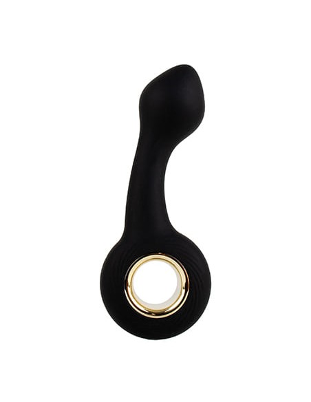 Se trata de un juguete muy ligero, con un eje curvo, muy flexible y punta más ancha que el resto del eje. Gracias a su diseño es perfecto para masajear de forma directa la próstata. Tiene un acabado suave y sedoso, de silicona, y su agarre añade un detalle dorado con un agujero para encajar los dedos y hacer el maneje más direccionado y cómodo. La base es ancha asegurando una penetración segura. Tiene dos únicos botones de control haciendo práctico e intuitivo su uso.