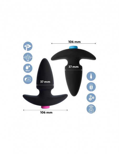 | FunkyButts Remote Controlled Butt Plug es un Kit de 2 plugs anales con control remoto que son perfectos para los juegos anales en pareja o para experimentar el mundo anal. Están fabricados en silicona médica apta para el cuerpo y el mando de ABS, los plugs tiene una bala rosa y otra azul para diferenciarlos al igual que el control remoto, que tiene un botón de cada color para controlar por separado de ambos juguetes. Disponen de 10 modos de vibración cada uno, con motores silenciosos y el control remoto tiene un alcance de 10 metros. Pueden usarse con o sin control remoto, el mando funciona con 1 Pila LR23 (Incluida) y son resistentes a salpicaduras. Son recargables por cable USB (Incluido), su tiempo de uso es de 1h y sus medidas son: 11 cm (Largo Total) x 6,7 cm (Insertables) x 3,7 cm (Diámetro). Se recomienda usar lubricante de base de agua para una mejor inserción. Caracterísiticas Principales: Kit de plugs anales con control remoto. Perfectos para los juegos anales en pareja. Fabricados en silicona médica apta para el cuerpo y mando de ABS. Cada plug tiene una bala de distinto color (Rosa y Azul) para diferenciarlos. Control remoto con alcance de 10 metros. Control remoto con 1 botón de cada color (Rosa y Azul) para controlar por separado ambos juguetes. 10 modos de vibración cada uno. Motores silenciosos. Puede usarse con o sin control remoto. Mando: Funciona con 1 PIla LR23 (Incluida). Recargables, cable USB (Incluido). Resistentes a salpicaduras. T.Uso: 1h. |