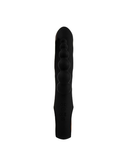 Con un eje principal recto, rígido y diseño realista de punta acabada en glande pronunciado. El motor del rabbit tiene forma de conejito con orejas flexibles y el motor del eje anal presenta bolitas de diámetro gradual muy flexibles. Tiene un acabado suave y sedoso, de silicona, y su agarre es dorado brillante con un agujero para encajar los dedos y hacer el maneje más direccionado y cómodo. Tiene dos únicos botones de control haciendo práctico e intuitivo su uso.