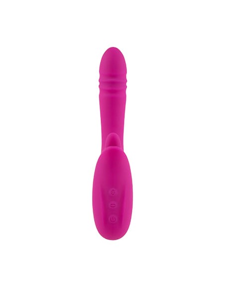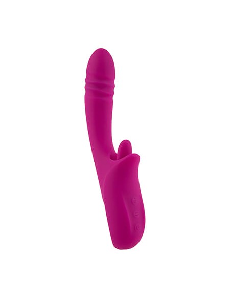 Se trata de un juguete muy especial y multifuncional, ya que añade la función de empuje en su eje principal y una lengua que crea suaves caricias o golpecitos para el clítoris. Es un vibrador rígido y de superficies suave. La punta del eje principal es ligeramente más voluminosa y curvada que el resto, ideal para acariciar la zona G. Añade estrías en la zona del glande dándole un toque realista y el agarre resulta muy ergonómico ya que se adapta cómodamente a la palma de la mano.
