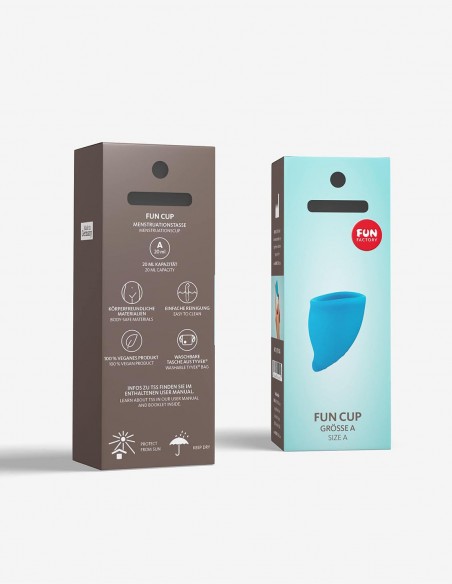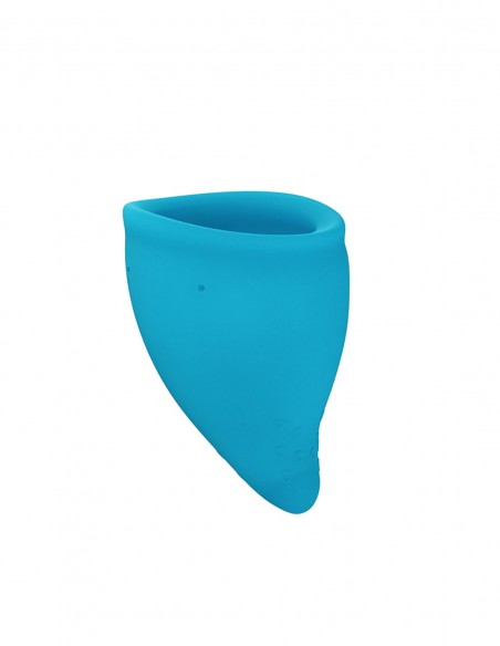La copa menstrual Fun Cup A en color turquesa es un recipiente de silicona médica apto para el cuerpo que se introduce en el interior de la vagina (lo mismo que un tampón), amoldándose a las paredes vaginales y recogiendo todo el flujo en su interior.