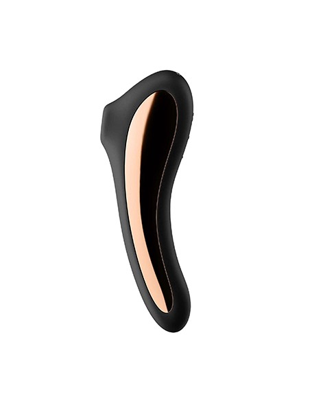 Un juguete con un diseño refinado, sofisticado, elegante y muy funcional. Posee una boquilla realmente suave que, al apoyarla encima del clítoris, se siente muy agradable. El agarre, que a su vez es penetrable para masajear el punto G, está ligeramente curvado y es especialmente ergonómico. En sus laterales encontramos un detalle de color dorado que le da ese toque sofisticado y lo diferencia de los demás.