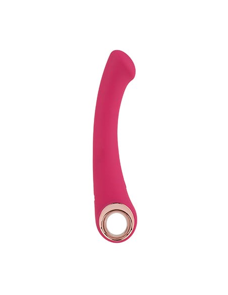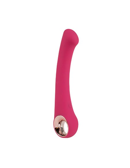 Con un eje curvado, flexible y acabado en punta aplanada ideal para masajear suavemente la zona G o para el uso como vibrador externo. Tiene un acabado muy suave y sedoso, de silicona, y su agarre añade un detalle dorado con un agujero para encajar los dedos y hacer el maneje más direccionado y cómodo. Se trata de un juguete especialmente ligero pero sorprendentemente potente. Tiene un único botón de control para recorrer entre sus 10 modos de vibración.